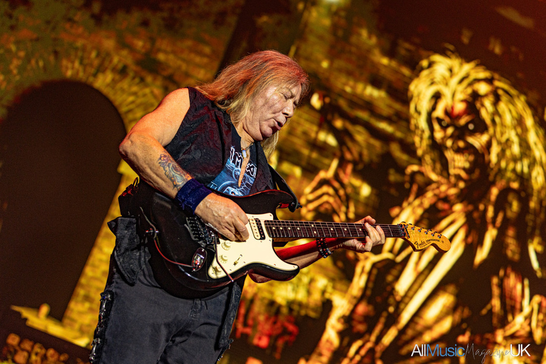 After Phantom of the Opera the setlist moves away from Iron Maiden's earlier punk trappings and towards their legendary New Wave of British Heavy Metal (NWOBHM) offerings. The iconic speech echoes across the Utilita ("...for it is a human number") and it's time for Number of the Beast. Pyro explodes and Bruce demonstrates that he's still able to hit that blood-curling, demonic wail. Following on from the touring staple that is Number of the Beast it's time for two relatively deep-cuts with The Clairvoyant (Seventh Son of a Seventh Son) and the title track from 1984s Powerslave. The slower pace of Powerslave allows the band the chance to settle into a rhythm that has felt slightly absent during earlier songs. It's an epic song complimented by some sublime, evocative set design and it highlights the musical craftsmanship that has defined Maiden over the last 50 years.