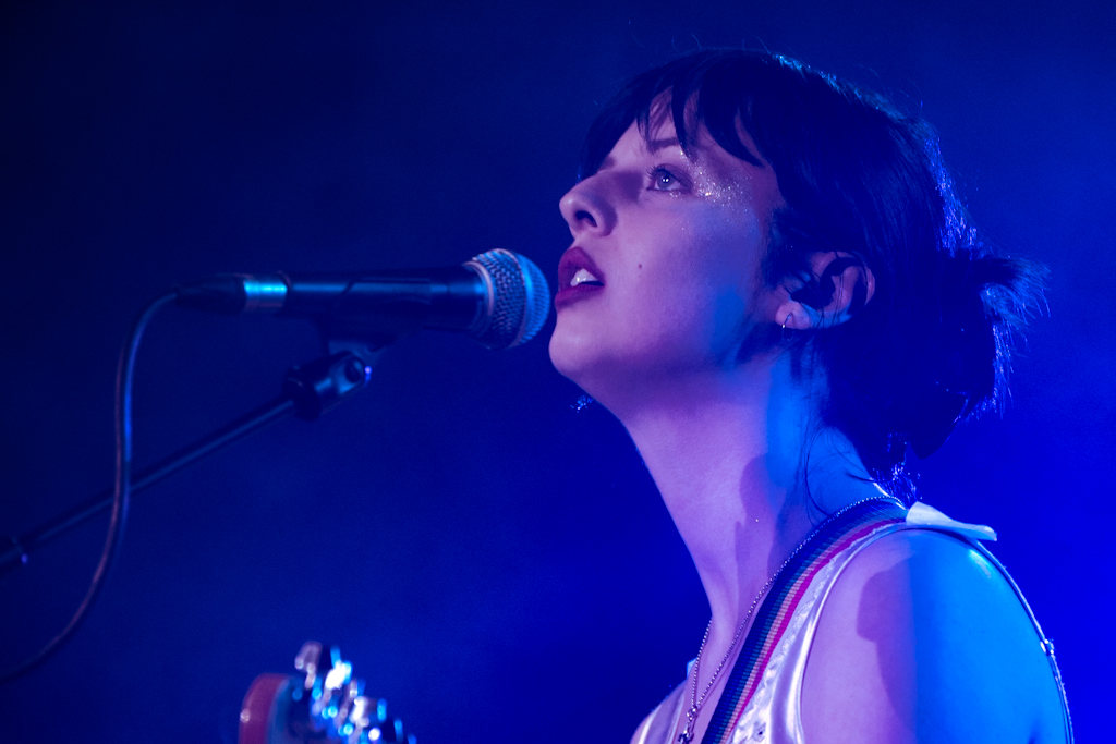 The last act I caught before Fat Dog’s headline set was TTSSFU, a shoegaze/dream pop singer-songwriter originally from Wigan. Tasmin Stephens, formerly part of post-punk band Duvet, is an absolute powerhouse of a performer with smooth, heady vocals and an effortless sense of style. She took to the stage barefoot, in a flowy white dress with fragile tape poking out from underneath alongside her band who were all donning a simple white shirt and tie.