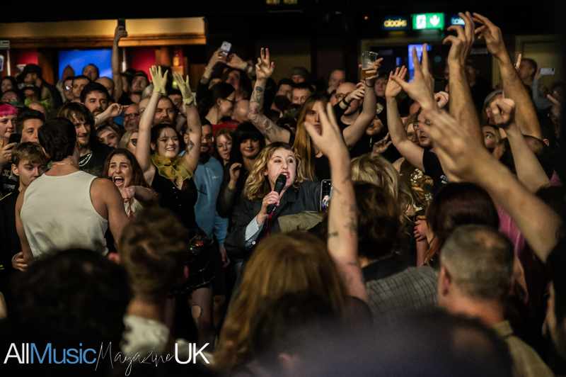 “Company Culture” follows without a break. The vocals are sharp, defiant, and gorgeously unpolished, the sort of delivery that feels like it’s coming from someone stood right next to you, rather than on stage beneath a spotlight. The crowd scream every lyric back and the band feed off their noise. The political edge to the song hits hard and there’s a collective sense that these themes are lived realities, not abstract thoughts and ideas.