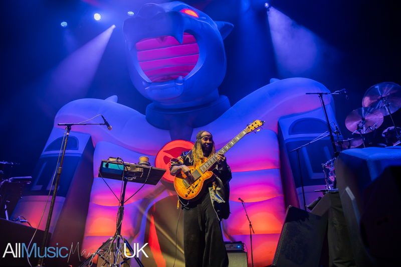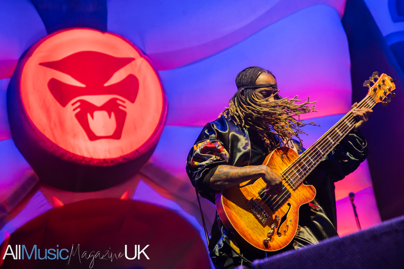 The opening is immediate and unapologetic. “Children of the Baked Potato” surges forward with a restless energy, its jazz-fusion complexity acts as both an invitation and a warning. Tonight is not going to be a polite run-through of fan favourites. Instead, Thundercat stretches the song into an elastic jam, his six-string bass spiralling through impossibly fast runs, showcasing the immense talent early doors.
