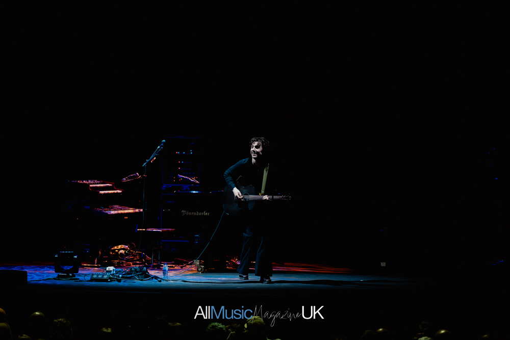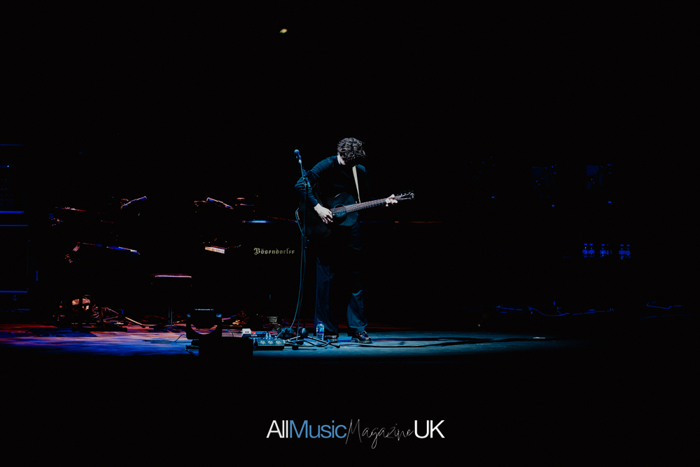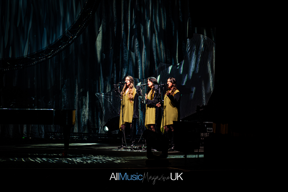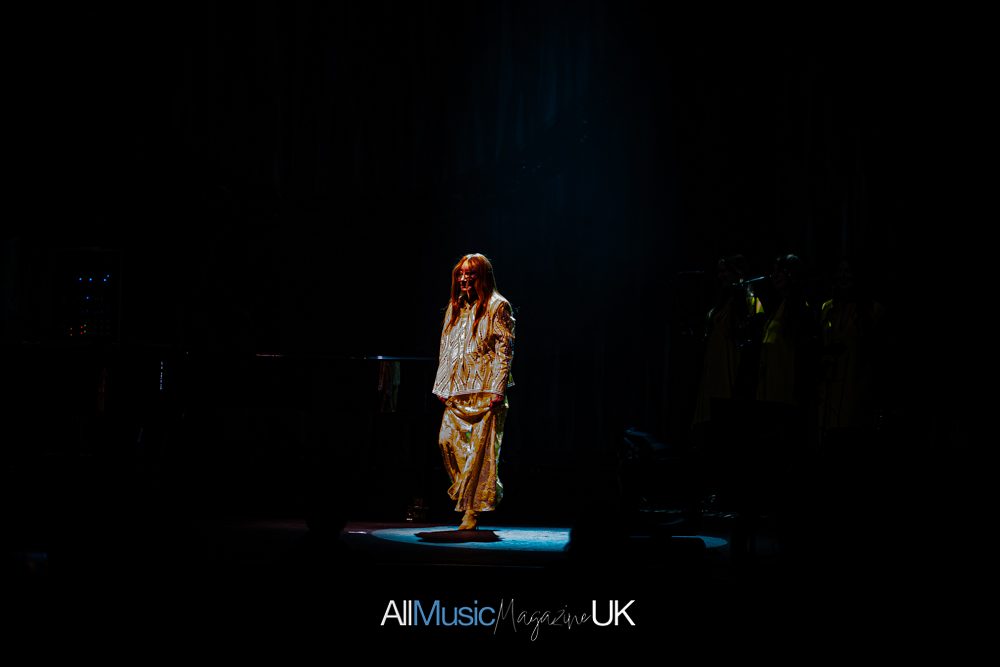 The set doesn’t start so much as materialise. Sounds drift in, percussive fragments, little sonic fingerprints between songs that make it feel less like a gig and more like you’ve wandered into some ongoing ritual halfway through. She’s seated, but don’t mistake that for stillness — she’s moving constantly, sliding between grand piano and twin keyboards like she’s got more hands than you can see.